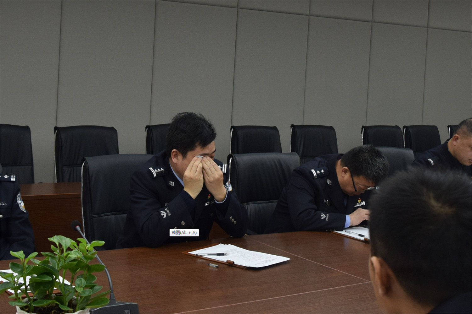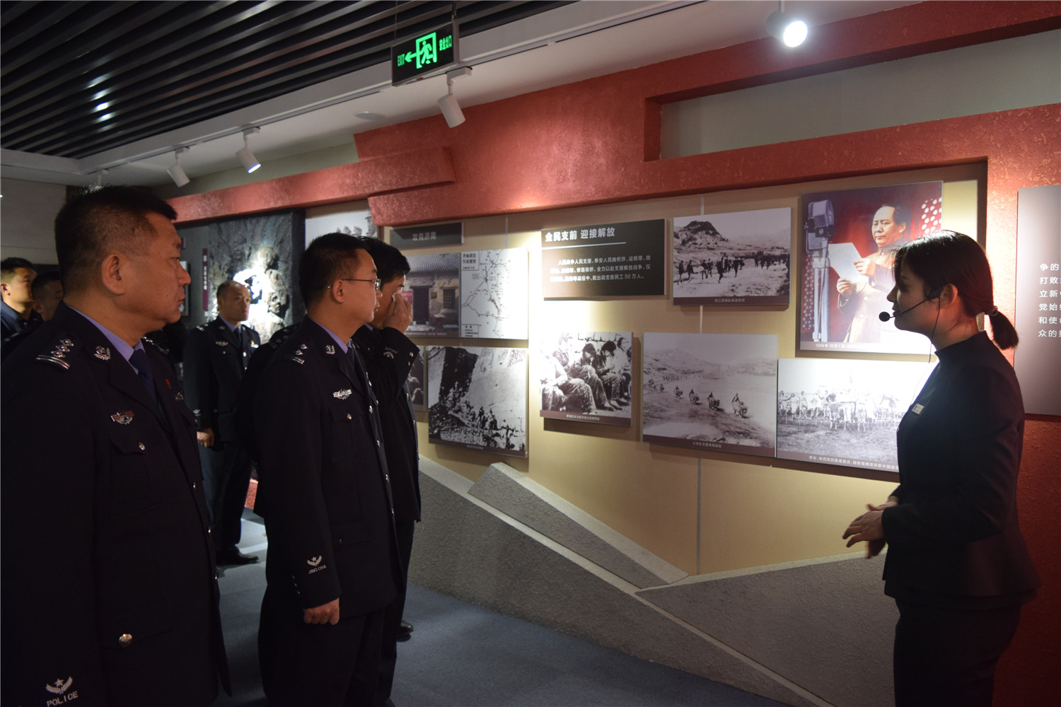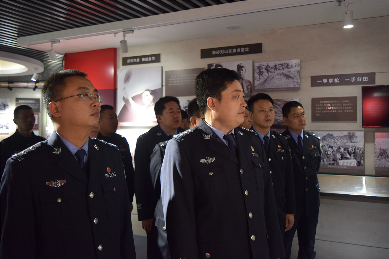 在革命烈士朱霄的展板前,我们了解到朱霄烈士为了革命事业,不顾老父亲的强行劝阻,跳下了回家的列车。这一跳,他再也没有回到家乡,没有回到自己的父母身边,而是化为了齐鲁大地上的一缕忠魂。当讲解员低沉而又悲痛得讲到这里的时候,我在赵振兴大队长的右后侧站着,看到一向勇敢而又乐观的大队长热泪盈眶,泪流成河。那一刻,我愣住了,四年多的朝夕相处,工作中遇再大的难关,吃再大的苦,他也没有流过一滴泪。可是,今日,此时此刻,在这里却潸然泪下。